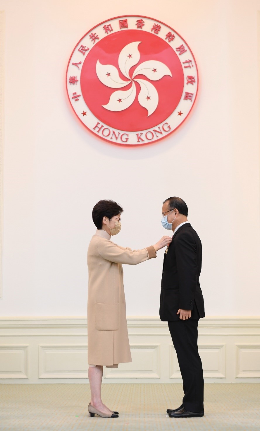 2021年度勋衔颁授典礼20日起一连三日在香港礼宾府宴会厅举行,香港行政长官林郑月娥在首日典礼上颁授勋衔和奖状予157名授勋人士。其中,全国政协常委、香港新华集团主席蔡冠深由林郑月娥颁授大紫荆勋章(大紫荆勋章是香港特别行政区授勋及嘉奖制度下的最高荣誉),以表彰他对香港的重大贡献。